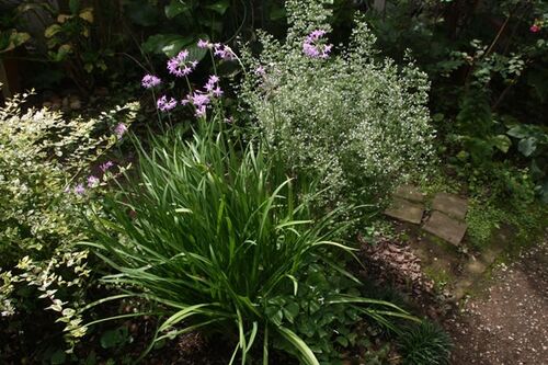 半日陰の小さな庭、その真ん中の比較的陽の当たる場所にこのツルバキアとカラミンサがいます。ほんの小さな区画なんですけどここが結構私のお気に入りの場所なんです。ツルバキアは「あまり肥料がいらない」って以前から思ってましたがここには去年までバラ…