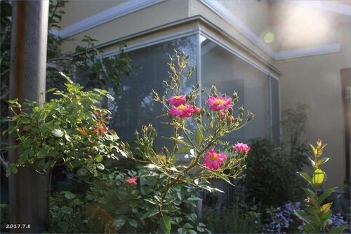 7月のm's small garden 朝一番に射す光も すっかり夏です。 咲きだしているのは ラベンダードリームのシュートの先。 小さな花がいっぱい集まって咲くブーケ咲きの四季咲きバラ。 思いっきり明るくて賑やかで愛らしい、そんな女の子みたいなバラです。 秋か…