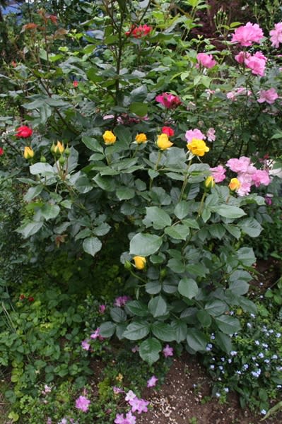 一番前にマイダスタッチ、その後ろには赤いバラのノックアウト