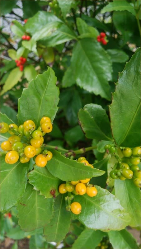 黄色と赤の千両の実が色づいてきました。
