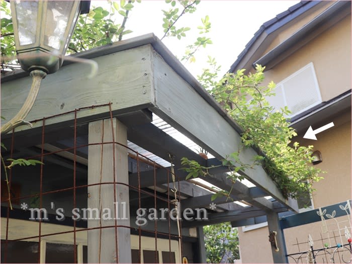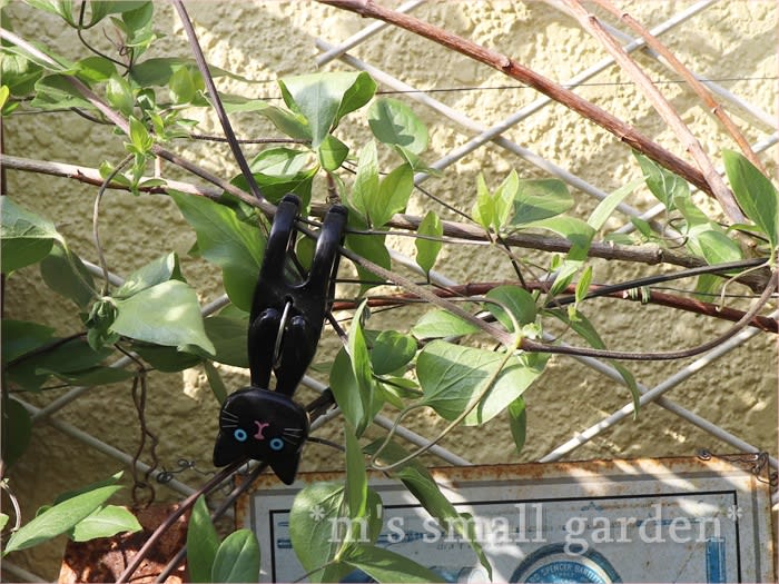 上へ上へ直行するクレマチスの梢にちょっと重石代わりに